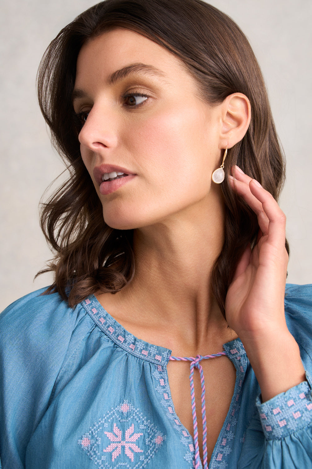 Simple and refined, these cream stone drop earrings are finished with 18k gold hardware and hook fastenings. Lightweight and versatile, they’re the perfect everyday pair, adding a touch of understated polish to casual and dressy outfits alike.