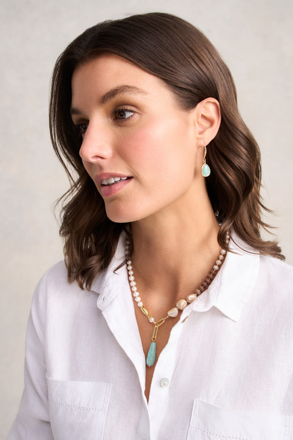 A timeless style with a fresh twist, these blue stone drop earrings are set on 18k gold hardware with hoop fastenings. Their clean, modern design makes them easy to wear with any wardrobe.
