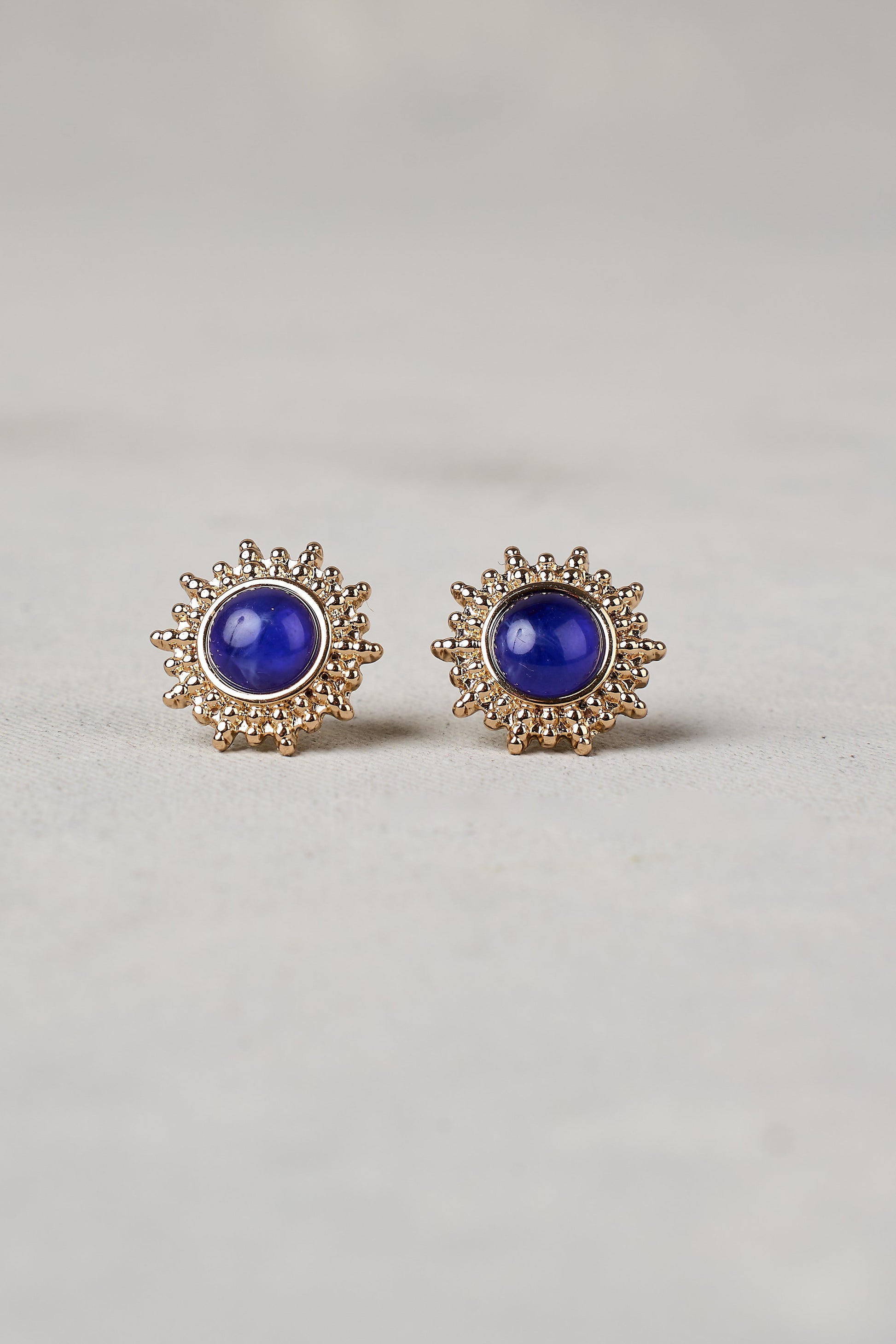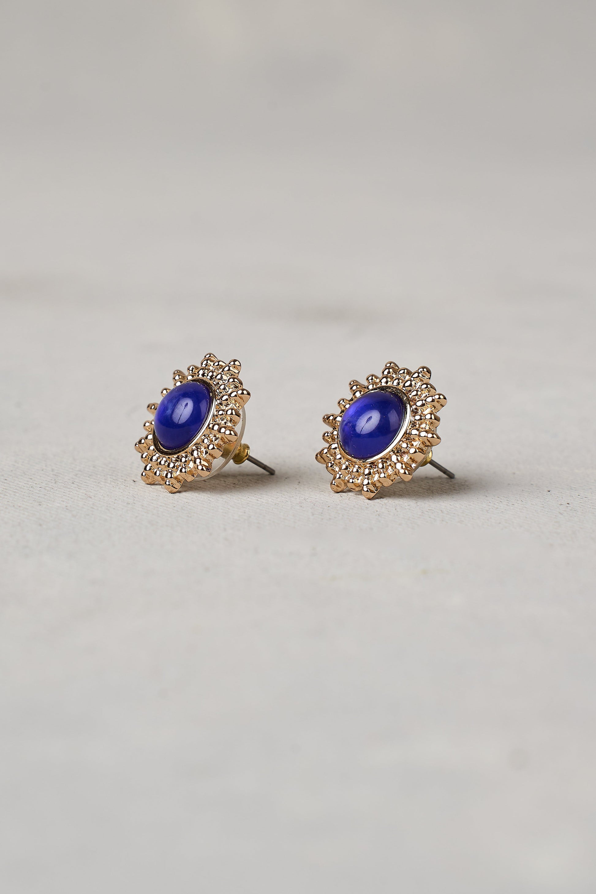 Radiate style with our Stone Stud Sun Earrings, featuring a bold blue resin stone set in a striking sunburst casing. This accessory is equal parts celestial charm and modern edge, perfect for adding a touch of drama to any look.