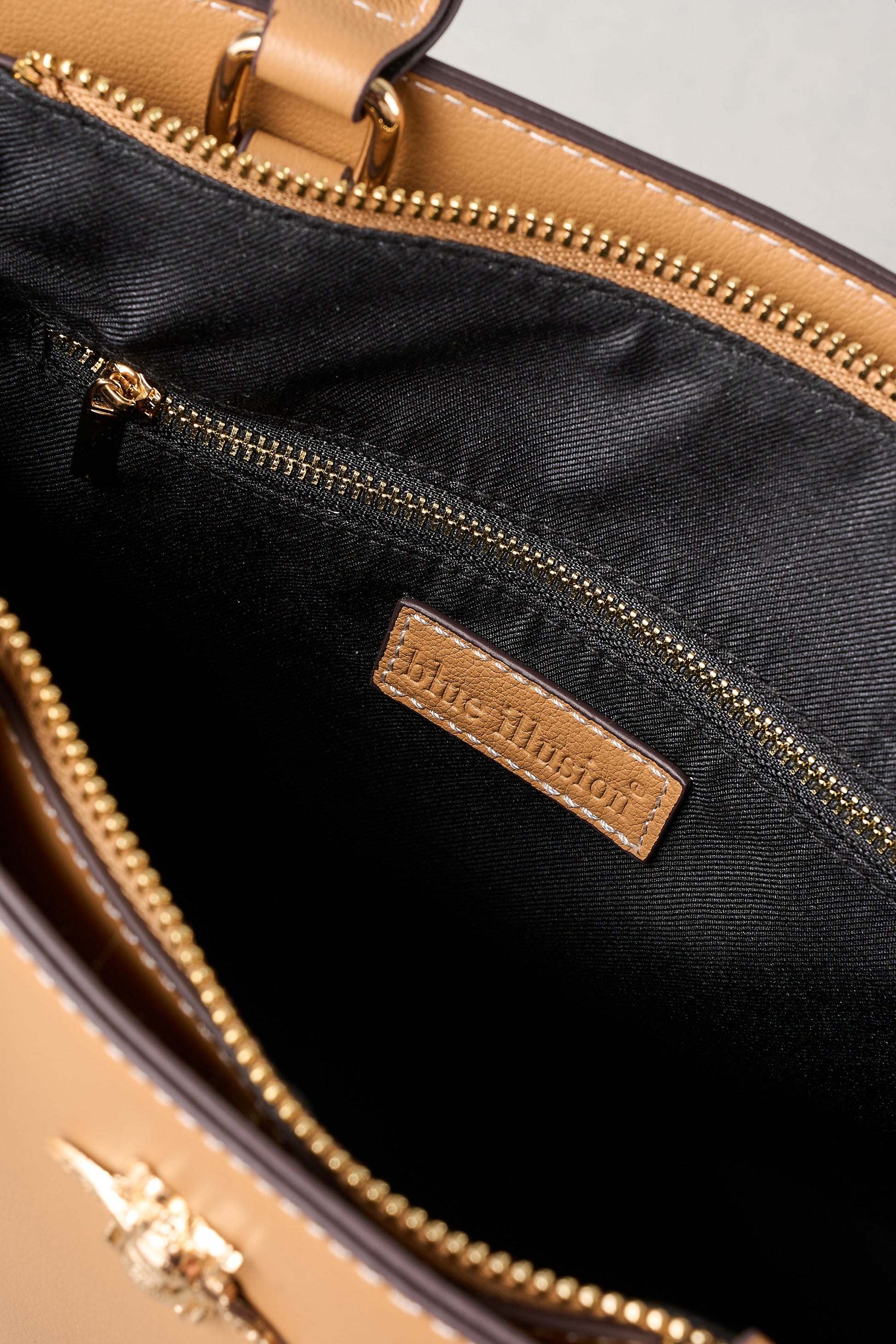 Elegant and everyday-ready, this structured tote in timeless Tan is designed for both form and function. Crafted in smooth leather and gold hardware, it features three roomy compartments, a bee motif for charm, and a detachable crossbody strap for versatility.