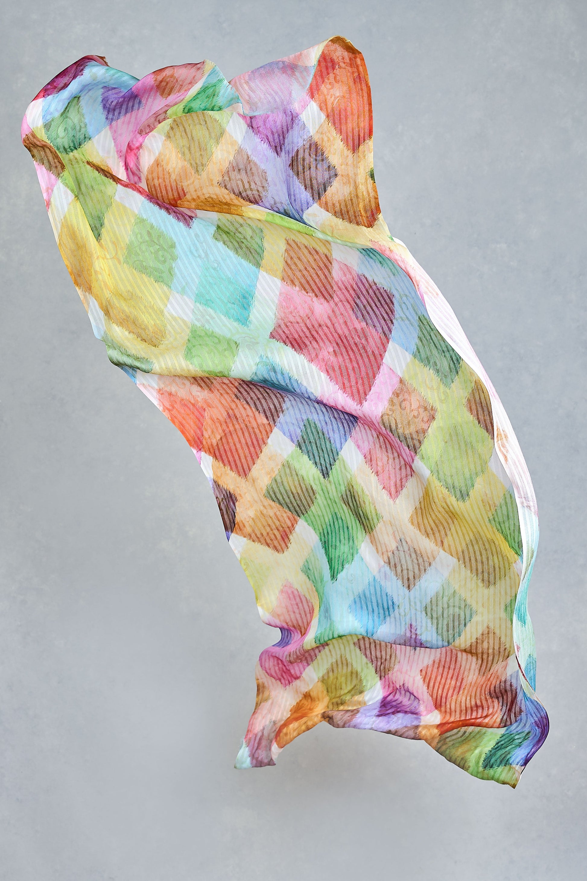 Bursts of rainbow colour bring playful energy to this pure modal scarf, while the diamond texture adds depth. Light and easy to drape, it’s a joyful way to brighten everyday outfits, whatever the season.