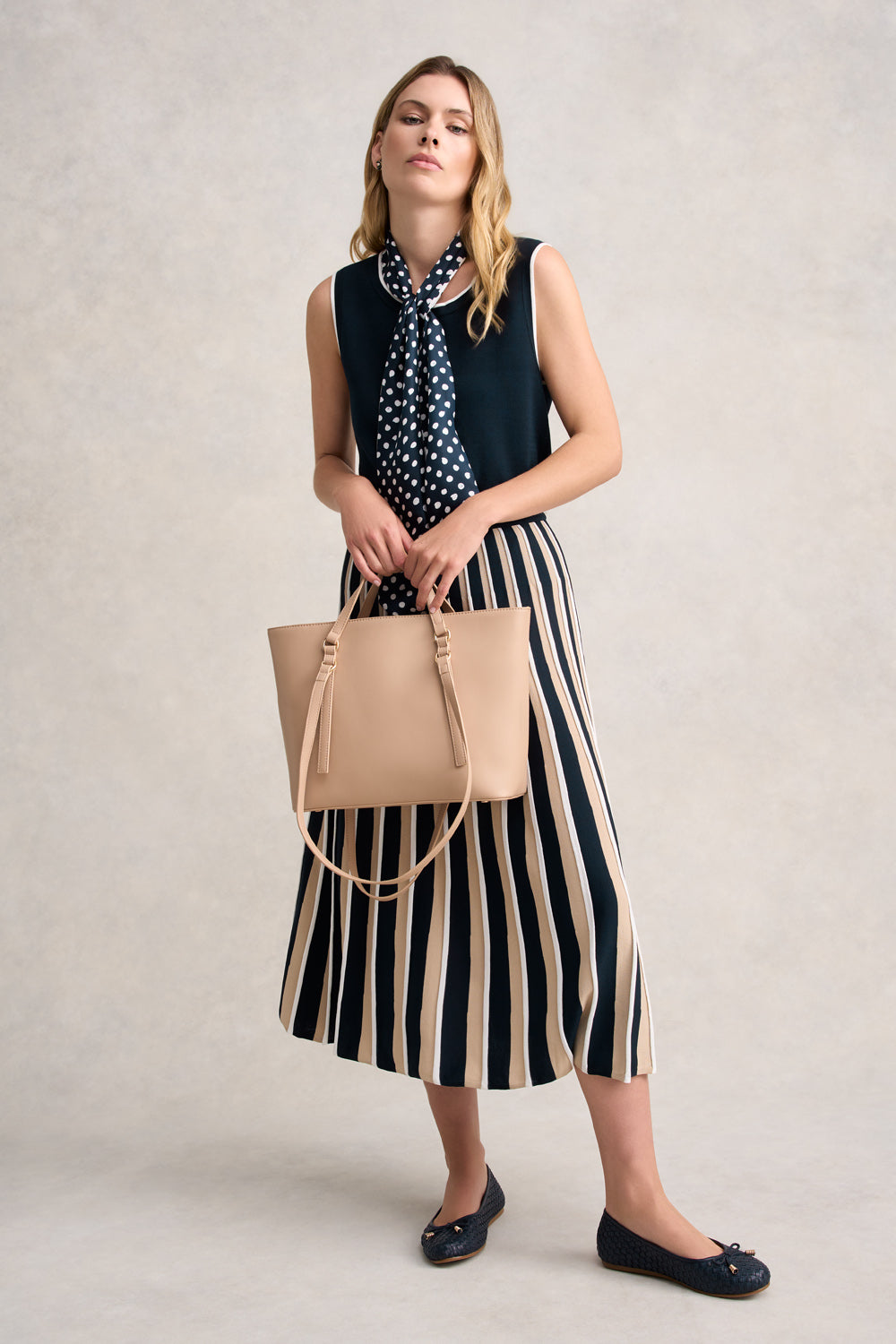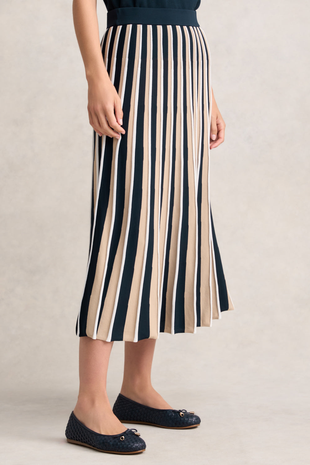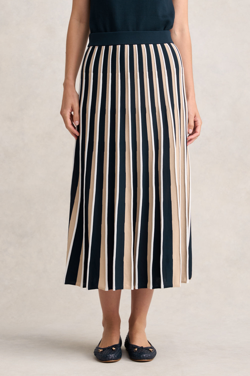 This midi-length skirt boasts a Deep Navy, Sand and White stripe. A fully-fashioned knit complete with a flattering A-line silhouette and pull-on elasticated waistband, the stripe pattern creates a playful pleat effect. Perfect for the office or a smart casual event, pair this modern skirt with a crisp white shirt, our Half Sleeve Wool Knit or Sleeveless Cotton Knit for chic corporate style.