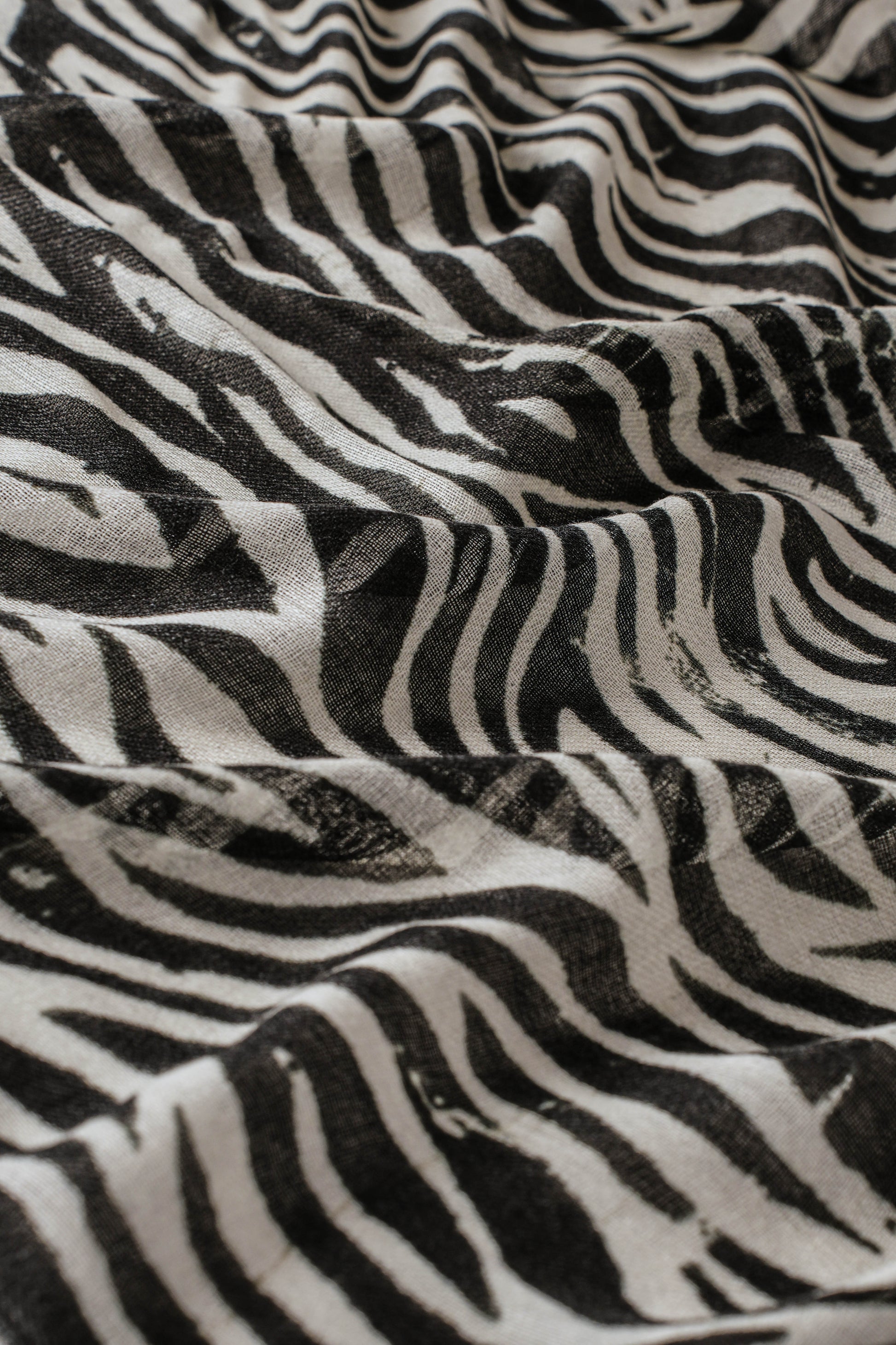 Bold yet refined, this monochrome scarf is crafted in fine wool with a striking zebra print. Lightweight with a soft feel and delicate frayed edges, it brings quiet confidence to neutral dressing.